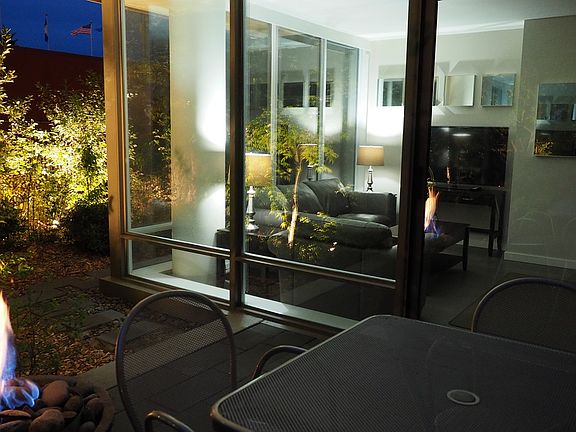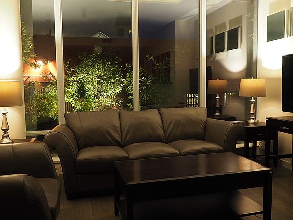 Stay in the center of the city and feel like you are in the center of the forest! On the corner of Douglas St. and Burdett Ave, just steps away from the inner harbor, are Vancouver Island's most luxurious residences: The Falls. This one-bedroom condo has two televisions, white linens, gas barbecue, washer/dryer, air conditioning, power roller blinds, but the best part is the large outdoor private patio surrounded by trees and tranquil ponds. There is very little street traffic noise, so combined with the concrete construction of the building the entire suite very peaceful and quiet. High speed wireless Internet and TV channels with five TELUS Theme Packs of your choice are included. An electronic token allows secure access to the building lobby, swimming pool/hot-tub/fitness room, and underground parking (only the hot-tub is heated during the winter months). The kitchen has a Bosch gas cook top, AEG wall oven, Bosch dishwasher, Panasonic microwave, Thermador integrated refrigerator/freezer with ice maker, and Weber gas barbecue. Equipped with all the dishes, cutlery, pots & pans, blender, coffee maker, toaster... everything you expect (including some you may not, such as the Kohler touchless faucet). All utilities and twice monthly cleaning service included. The Falls is a non-smoking building and so is this suite. Minimum 30-day lease but stay as long as you like. Rent is negotiable. You will not find a condo that is better equipped, maintained, and clean. The owner lives in the building and is available 24/7 if you ever have any questions or concerns. You will love staying here!