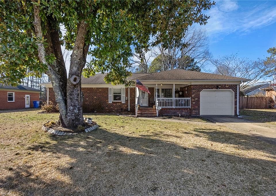 Great ranch home, renovated in 2016, with a large front porch and open floor plan with kitchen overlooking the living room and the formal dining room. The kitchen has a large island with bar seating, granite countertops, custom 42-inch cabinets with pantry built-in near the refrigerator, and stainless steel appliances. The home features 3 bedrooms with the primary bedroom having a walk-in closet, private bath with tiled shower, and private access to the backyard. The backyard is massive!!! With a shed that has power, wooden deck off the primary bedroom, raised garden boxes, and wooden privacy fence. The single car garage has the water heater, attic pull-down, and a new garage door being installed. HVAC was installed in 2018, along with the duct work. Roof is a 35 year architectural shingle put on in 2016. Great quiet community, located close to interstate 64, in the heart of Chesapeake.