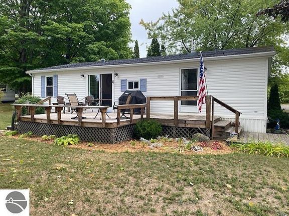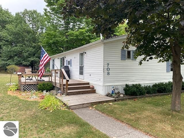 Updated Mobile in Vacation Village with shared frontage on Bass Lake in the Village of Elk Rapids. This double wide home features 3 bedrooms 2 baths with a split plan of primary bedroom and private bath with walk in closet on one end of the unit and the other two bedrooms and bath on the other ideal for privacy. The kitchen has been upgraded solid wood cabinets and quartz counters opens into the dining area and living room. Convenient laundry room is off the kitchen. All appliances including the washer and dryer to stay with the home.There is a very large deck, great for enjoying the lovely outdoor space. Large shed great for extra storage. Bass Lake shared frontage for residents. Keep your kayak at the lake and enjoy your little slice of northern Michigan. Vacation Village is a 55 & Over Community, Lot rent is $421 monthly.