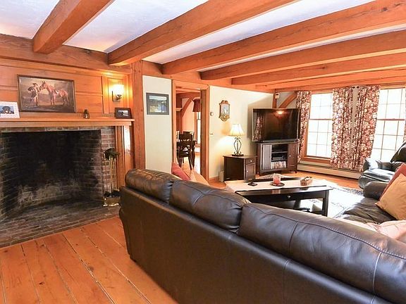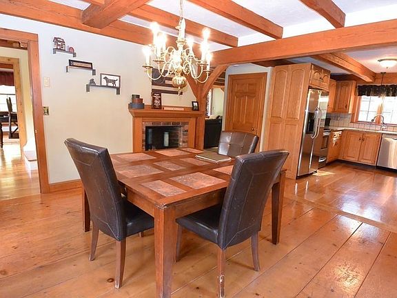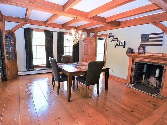 Country Charmer! This rustic, timber framed saltbox colonial brings you back in time with 5 brick fireplaces, exposed beams, wide board pegged floors & warm cozy feeling! The updated kitchen includes granite countertops & stainless appliances. 3 full bathrooms all with granite counters as well! Nice open kitchen to dining room with fireplace offers great space to enjoy a meal by the fire! The living room features a huge center chimney fireplace, wood floors and access to the oversized back deck. The formal living room with fireplace and wood floors offers another area for relaxation or home office duties. The back hallway includes a full bath, laundry room & access to the huge bonus room above the garage ideal for a game room, exercise room or just an enormous family room! The garage is really an oversized barn w/ wood beams, workshop areas & room for many vehicles! Upstairs are 3 bedrooms plus a unique lofted area. The master features its own brick hearth & full bath. Great setting!