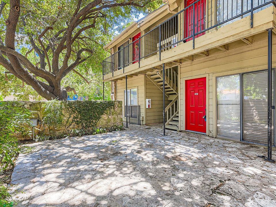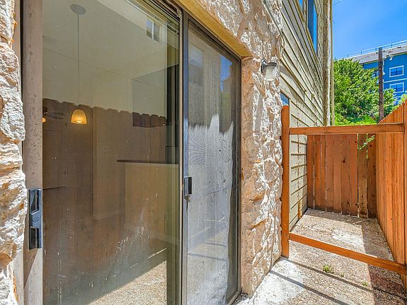 Minutes from UT!! Prime location, just blocks from campus. 2 bedroom/1 full bath in small 2 story condo community. Kitchen features stainless range & microwave. Refrigerator stays. Laundry closet with washer & Dryer convey with property. Carpet free condo with tile floors in common space and wood look floors in bedrooms. Fenced backyard off kitchen and bedroom. Beautiful front courtyard with heritage oak tree. 2 assigned parking spots, marked 101.