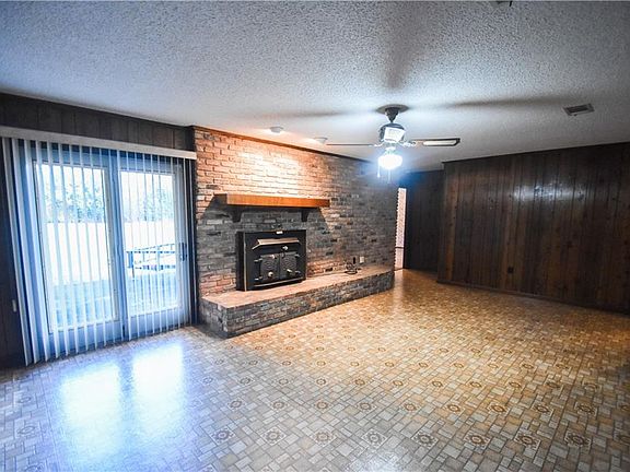 WOOD FIREPLACE SITS IN A LARGE LIVING ROOM WITH PATIO DOORS JUST WAITING ON A RECLINER.