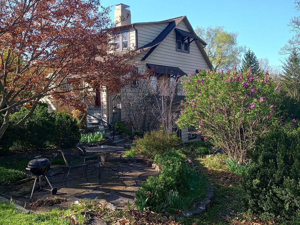 Stone walking pathsLarge covered porchLarge roomsMature treesLarge windows