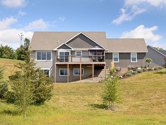 Enjoy peace & serenity in this pristine custom walkout rambler, where thoughtful design meets timeless comfort. An open floor plan & vaulted ceilings create a bright, inviting atmosphere, while the oversized kitchen features stainless steel appliances, granite countertops, birch cabinetry, & a walk-in pantry, perfect for everyday living & entertaining. Elegant details throughout include enamel trim, 3-panel doors, faux wood floors, a fireplace with tile & wood surround, & knockdown ceilings. The spacious primary suite offers a box-vault ceiling, custom closet, & transom window. The main level also features a convenient laundry room for added ease. The walkout lower level is an entertainer’s dream, complete with a media area, billiard/game space, 3rd bedroom, full bath, & second-zone heating & cooling. Step outside to a new paver patio & walk way (2025) and enormous deck with panoramic views of the countryside—ideal for relaxing or hosting guests. The homeowner added additional new trees in the summer of 2025.