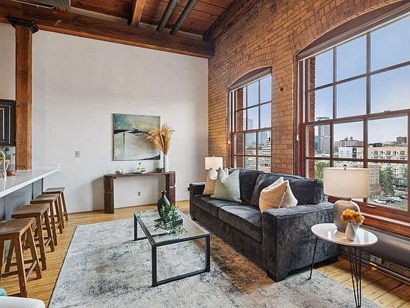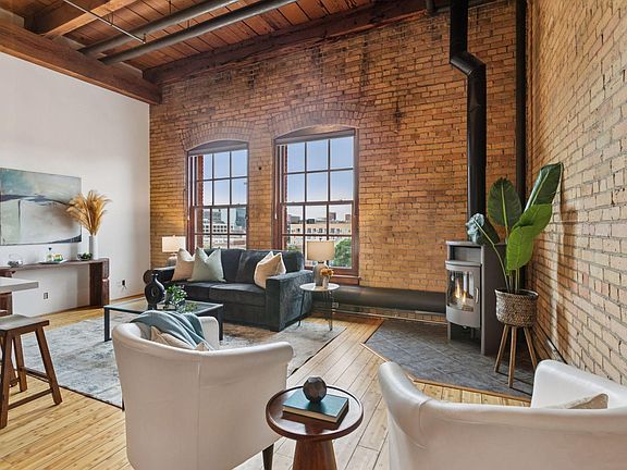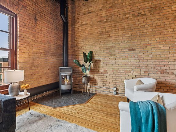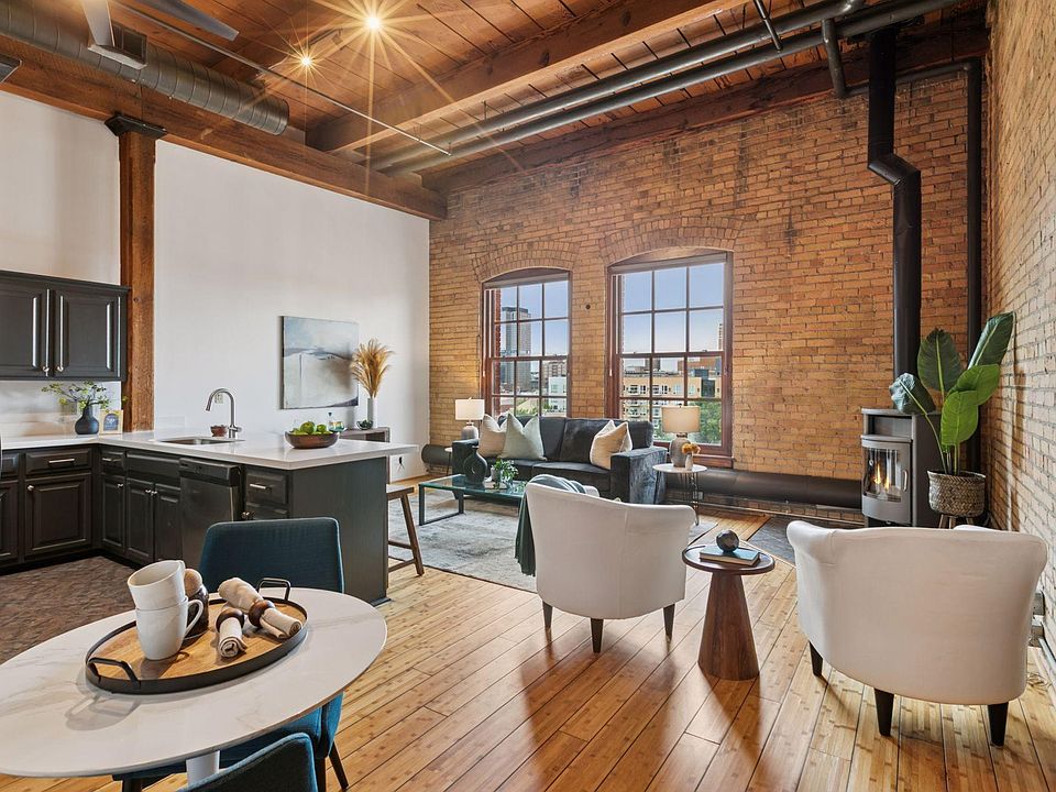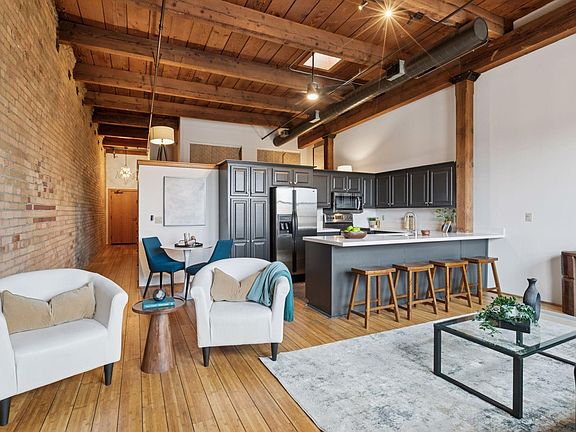 Penthouse level condo at The Itasca in North Loop! Coveted for its exposed brick walls, 13’ high timber ceilings, open hallways, and 1900’s architectural beauty, this moody condo has been updated top to bottom! A completely open concept floorplan allows you to enjoy all of the historical elements and windows from every room. The refreshed kitchen features quartz countertops and island seating for 4+ and overlooks the living room with freestanding gas fireplace and dining. Unique lofted bedroom with a full wall of closet space and spacious updated full bath. Private office space and in-unit laundry, too! Plenty of storage within the unit includes a finished crawlspace area under the bedroom. Seller to pay for 2 years of parking at the Itasca Lot just outside the building! Outdoor grassy area for residents with fire pits and sitting areas. Incredible location ½ a block to the river and trail system and steps to endless restaurants and entertainment! Welcome home!