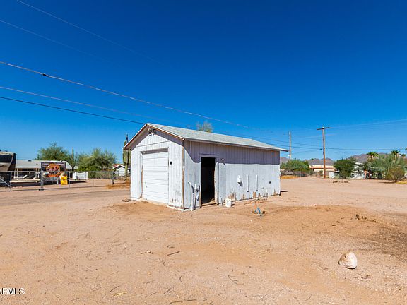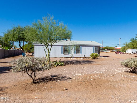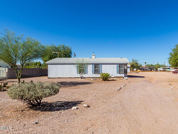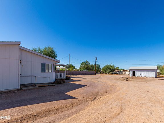 Fantastic opportunity to own this 2-bed, 2-bath manufactured home on close to 1/2 an acre. Enter to find a large living room paired with tons of natural light and vaulted ceilings that add to the airy feel. The eat-in kitchen has wood cabinetry & a breakfast bar. Both bedrooms are perfectly sized, with the main bedroom boasting two closets & a private bathroom. Laundry room offers attached cabinetry. Out the back, you have a covered patio to relax while enjoying the neighborhood's tranquility. The detached car garage is a plus, ideal for a workshop or storage as well. Plenty of room for additional parking & landscaping possibilities! This home is surrounded by stunning natural landscapes, including the Superstition Mountains, Tonto National Forest, and Goldfield Mountains. Residents can enjoy hiking, biking, and outdoor activities in this beautiful desert environment.