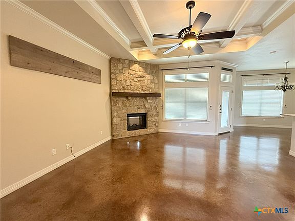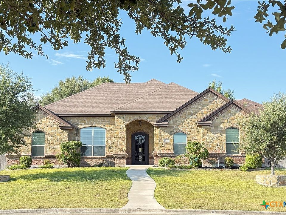 Timeless Distinction! Experience the finer things in life in this vividly appealing Lackmeyer built home! Situated on a 1/3 acre cul-de-sac lot in desirable Warriors Ridge subdivision, this home offers a floor plan that’s functional, flexible, & adaptable. Multi-level roof lines & a brick & native stone exterior present an eye-pleasing façade, emphasizing the contemporary design. The interior balances practicality & beauty; starting with the front door welcoming visitors & ushering them into the spacious foyer leading past the French door enclosed Study—or 4th bedroom—to the impressive living room graced with a tiered, cross-beamed ceiling, a stone-clad corner fireplace, & transom-topped windows capturing a view of the back yard. Warmly hued, newly refinished easy-care stained concrete flooring expands throughout the main living & wet areas. Dramatic kitchen offers custom cabinets & counters topped with exotic granite, stainless steel appliances—to include a pot faucet— plus pendants illuminating the breakfast bar. The cozy dining area also takes advantage of the views outside while making a gathering spot for family dinners inside. Primary suite sports brand new carpet, tiered, crown-molding enhanced ceiling, & a lavishly appointed bath with a free-standing, deep soaking tub for relaxing, a mesmerizing, oversized, tiled shower for those quick to get ready mornings, large vanity with dual sinks topped with framed vanity mirrors, & an expansive, walk-in closet. Two additional secondary bedrooms, positioned at the opposite side of the home share a full-size bath. The interior self-contained laundry room is outfitted w/additional upper & base cabinets. The side-entry, twin bay garage is equipped with garage door opener & additional storage cabinets. Extra amenities include: a covered & a pergola topped patios, & a recently rebuilt open wood deck beckon for outdoor enjoyment. Sprinkler system & fenced-in garden beds round out the amenities.