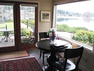 Gorgeous panoramic views, upstairs and down. 2 car garage, End unit, right on the lake, new dock, freshly painted. Custom decorated with open floor plan. Granite Countertops, stainless appliances. Gated front yard provides private hot tub area. Walk out your back door to the water and dock. Enjoy breakfast on the balcony - you won't believe the 180 degree views. Marvelous get-away!(yet right in town) And great for entertaining. Location, Location, Location!