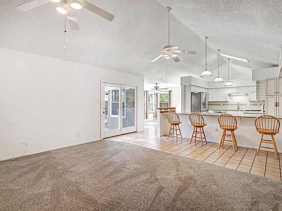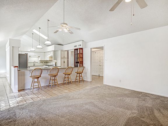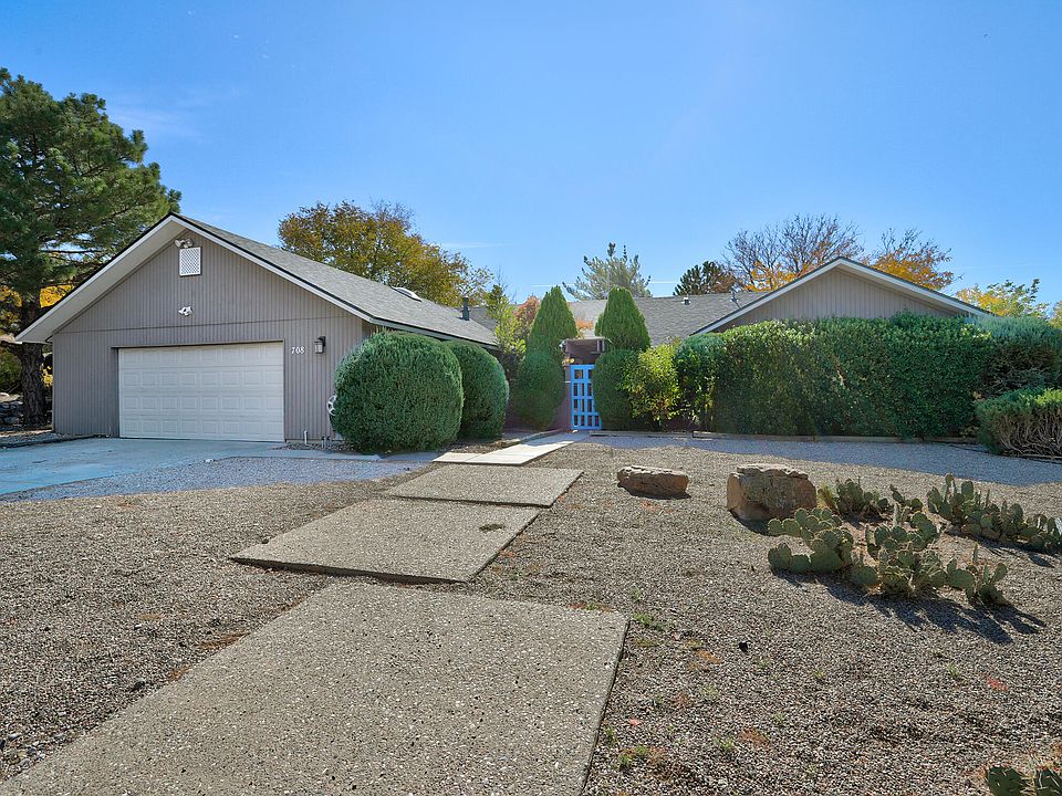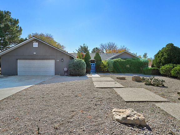 Welcome to this bright and inviting Four Hills home filled with natural light from cathedral ceilings and numerous skylights. The open kitchen features granite counters, a tile backsplash, and an eat-in bar that opens to the main living and dining areas, creating a comfortable flow for entertaining or relaxing. The large primary suite offers dual closets, double sinks, and a walk-in shower, while the additional bedrooms sit on the opposite side for privacy. Step out back to a peaceful yard with an inground pool, patio, mature trees, and a private spot for a firepit or outdoor seating. Enjoy a gated courtyard entry, oversized garage with built-in shelving and ample attic storage, just minutes from The Canyon Club, Kirtland Air Force Base, shopping, and scenic hiking trails.