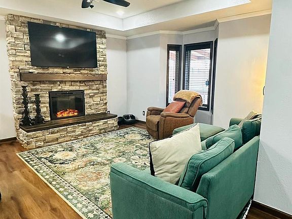 Discover comfortable living in this inviting 4-bedroom, 2-bath home featuring an open floor plan and a cozy stone fireplace that anchors the spacious living area. The kitchen is truly cook-friendly, offering ample workspace and granite countertops that continue into both bathrooms for a polished, cohesive look. Enjoy a very large backyard perfect for gatherings, play, or gardening, plus an outside storage building for tools and extras. The living room TV will also remain with the property, adding even more value. Move-in ready and designed for everyday convenience this one won't last long!