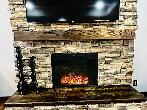 Cozy stone fireplaceAmple workspaceOpen floor planGranite countertops