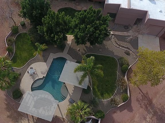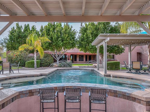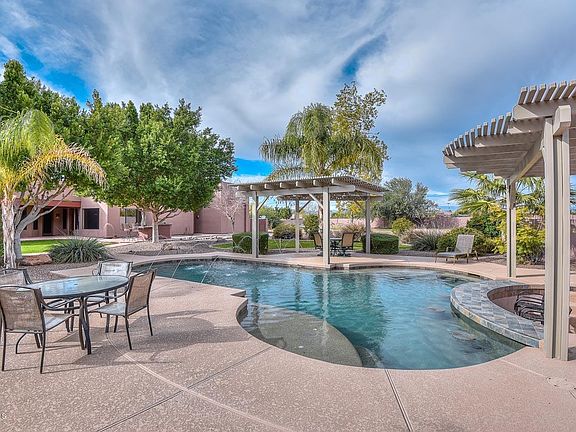 An amazing estate is what this home is. This over 2.5 acre estate has a custom built single story home with 4 bedrooms and 3.5 baths and just over 5,000SF of livable space. This includes an open kitchen and family room as well as a large game room or whatever you want it to be. There is also a game room or large study area outside the kids bedrooms. There is a large office with great views of the front yard and water feature near the kitchen. The 13' tall dramatic ceilings in the great room and kitchen make you feel like royalty with views of the backyard with the pool and swim up bar. The home also features a drive through RV garage for the family with ALL the toys. Keep the kids busy with the large concrete court that can be used for tennis, basketball, skate park or bike ramps. The 2.5 acre lot also allows plenty of room for the kids to ride and play in the gated compound so parents can keep an eye on them. When looking at the home be sure to look up to see all the custom wood detail on the ceilings as well as the custom wood built in cabinets through out. The owner really has put a lot of thought in the home with lots of custom details and lots of areas around the home to sit by the water features that are all around the property. This home is a must see to take it all in.
