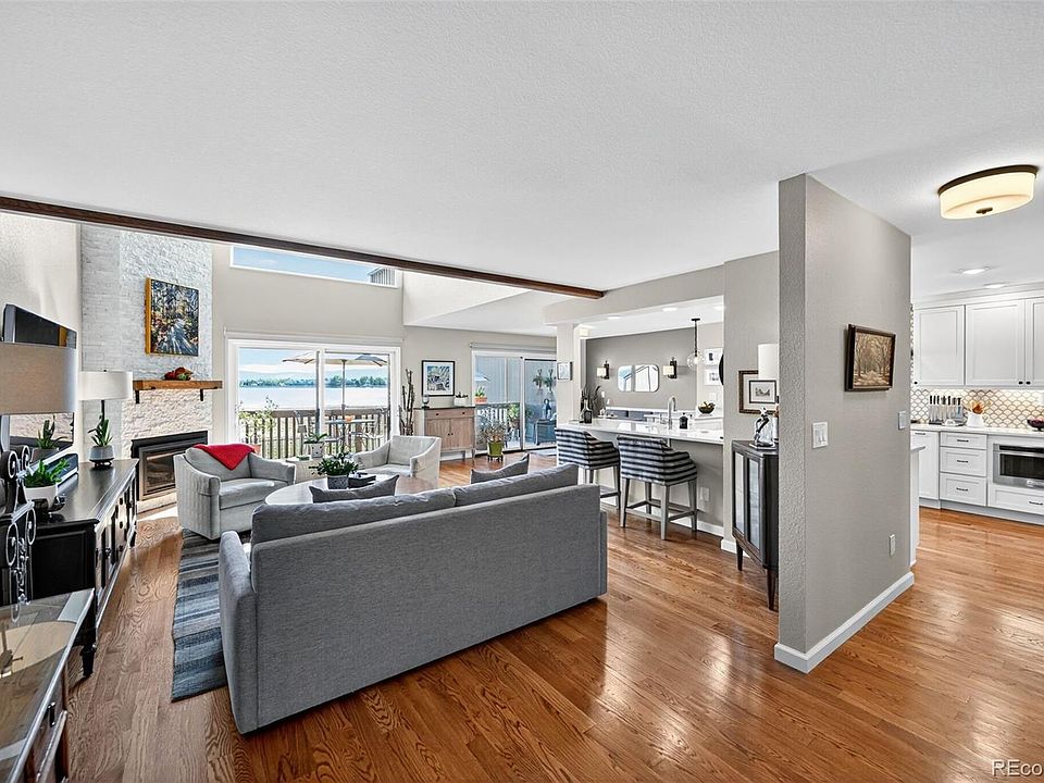 Stunning remodeled townhome bordering Marston Reservoir with uninterrupted views out nearly every window of the serene waters along with the southern Rampart Range mountains! This wonderful two bedroom, 2.5 bath home with a finished walk-out basement was exquisitely remodeled in 2020, with numerous designer touches added since. As you walk up the covered front porch, you will be greeted with a custom made Alder front door opening into the welcoming foyer with richly stained hardwood floors extending into the 2-story living room anchored by an expansive white stone fireplace containing a new gas insert and wood mantel. There are two sets of newer sliding glass doors that provide plenty of natural light and easy access to your renovated deck with an electric awning and natural gas BBQ. The open floor plan also beautifully highlights the remodeled kitchen with custom designed cabinetry with pull-out/soft close drawers, a pantry, expanded office nook and under cabinet lighting. High-end appliances including a gas Wolf stove and hood, along with a unique tiled backsplash and quartz countertop make this kitchen really pop! There is also a wonderful dining area with a built-in banquette, ceiling mount light and additional bar seating. The powder room is playfully decorated with a matching quartz vanity. The upper level features a loft area, with the best views in the house, along with a spacious primary bedroom, with his and her closets and a remodeled bathroom with a dual sink vanity and a large glass enclosed shower. The walk-out basement features an additional bedroom, a large finished storage closet and remodeled bathroom with a large soaking tub and quartz vanity. There is also a family room, with several built-ins plus the laundry room w/additional storage. You must see for yourself the many other unique features that truly set this home apart; from the wrought iron balusters, ceiling fans, exposed beams, custom tile, skylights and upgraded lighting. See it today!