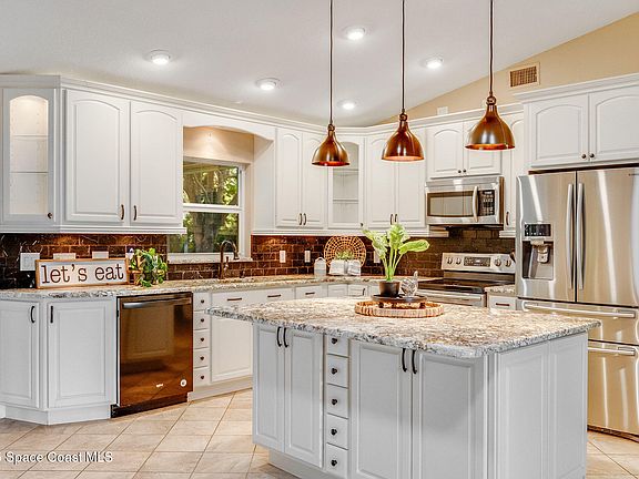 This Port St John home is move-in ready with the most tasteful updates. Enjoy a natural butterfly garden in the front yard, a 2019 roof, impact windows, and full hurricane protection. Inside, a bright open layout features tile flooring throughout, a crisp white kitchen with an oversized island, granite counters, and modern cabinetry with pull-outs. The remodeled owner's suite is a private retreat, while the screened porch and peaceful backyard extend your living outdoors. With a 2021 AC, this home blends comfort, durability, and Florida charm!