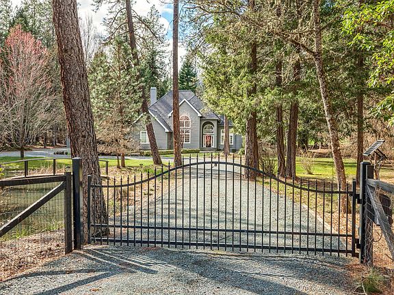 Welcome to the Oregon dream! Peace and serenity await as you enter the gated entry past a picturesque pond complete with a bridge to your personal island oasis. Immaculate custom home on 3+ level acres—lightly wooded, fully fenced park-like grounds with walking paths. Extensively updated, featuring gourmet kitchen with pull-outs, walk-in pantry, hearth room, family room with built-ins, vaulted ceilings, 2 fireplaces, and formal dining room with embossed wallpaper and lighted display cabinet. Main-level primary ensuite includes soaking tub, double vanity, and 2 walk-in closets. Upstairs offeers 3 bedrooms, 2 full baths (including Jack-and-Jill), and a large unfinished bonus/storage room. 3-car attached garage with built-ins and sink, plus 884 SF RV garage (with hookups), shop, garden shed, and dog kennel. Newer 3-zone HVAC and roof. Fresh carpet and pad, plus central vac. All appliances included! Don't miss this incredibly rare opportunity!