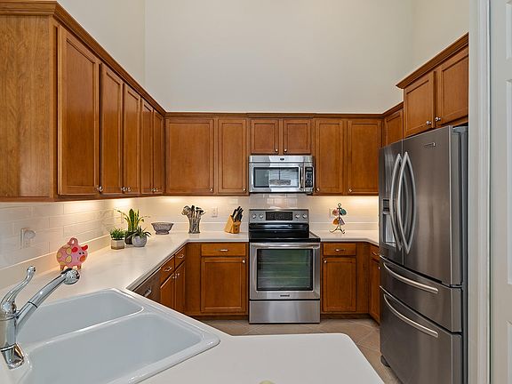 This popular Essex floor plan in the desirable Torrey Pines subdivision of PGA Village offers 3 BR, 2 BA, 1 car garage. Tile on the diagonal in the main living area and decorative vinyl flooring in all bedrooms. The kitchen has quartz countertops, tile backsplash, SS appliances, snack bar, all opening up to the great room and dining area. Large master suite with two closets and access to the lanai. The master bath has a walk-in shower, a separate soaking tub, and double sinks. Enjoy your morning coffee on the screened covered lanai with plenty of privacy. Accordion shutters around the home. Torrey Pines offers its own clubhouse and pool, and you will have access to the Island Club and all its amenities. DON'T MISS THIS ONE!