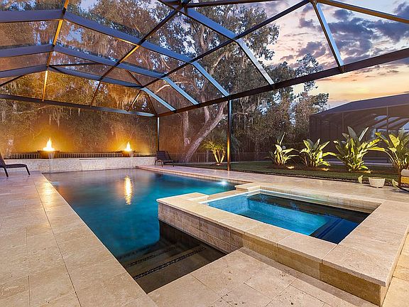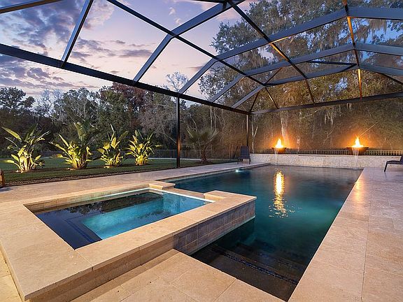 canopy of beautiful moss covered trees and lush tropicals. The heart of the outdoor space is a heated,