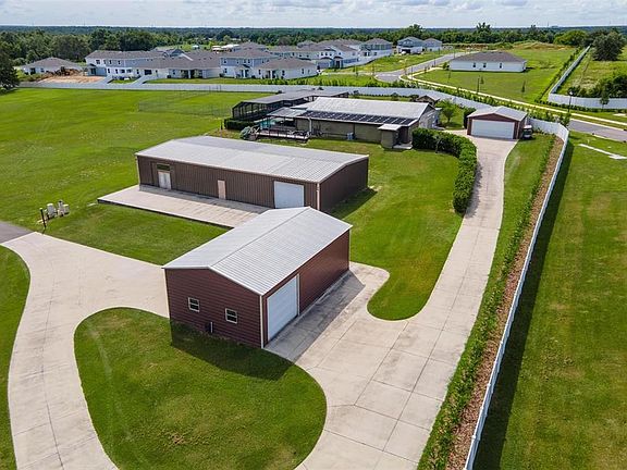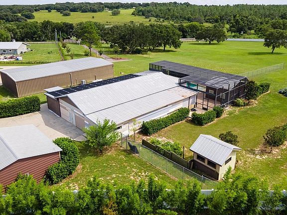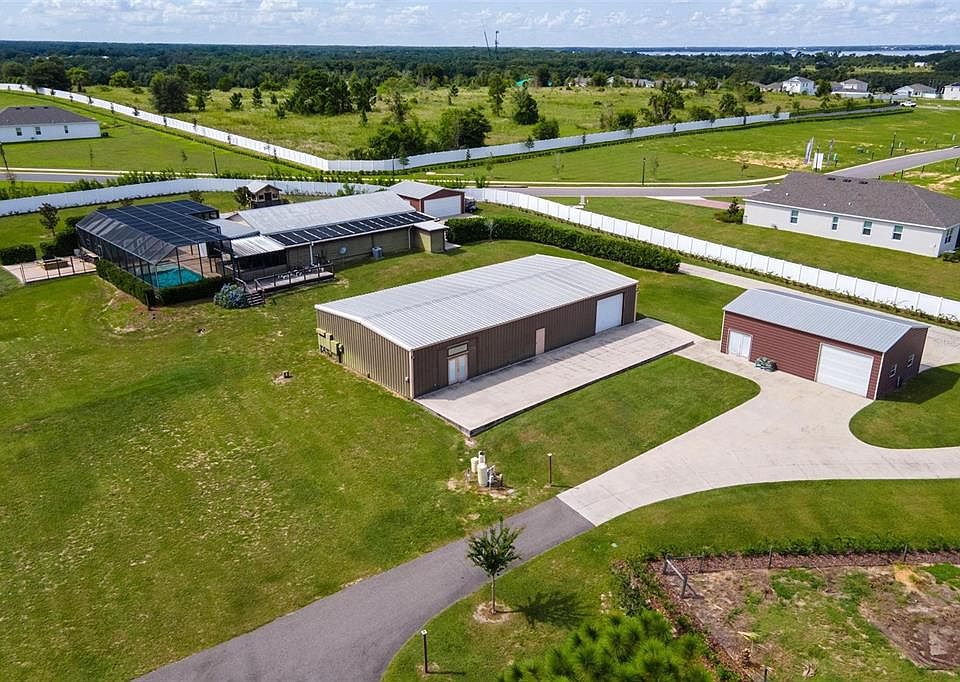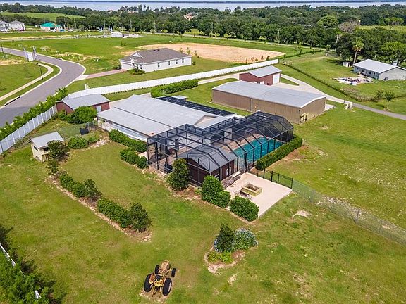 One-of-a-Kind Barndominium Estate on 5.6 Acres. Discover one of Lake County’s most unique properties, offering unmatched versatility and privacy on 5.6 fully fenced acres with 2 entry gates, main gate is solar powered. This exceptional estate features two barndominiums, multiple metal buildings, a pool, and a wealth of outdoor living spaces. The main barndominium provides 1,957 sq ft of stylish living space with 2 bedrooms, a spacious walk-in closet, an open kitchen and living area, and a large full bath with a beautifully tiled walk-in shower. Attached is a 1,243 sq ft storage/workshop with an overhead door and an expansive 80' x 20' concrete patio perfect for entertaining or hobbies. The second barndominium offers over 2,800 sq ft of open living space, complete with a full kitchen, bar area with kegerator, stainless steel BBQ station, outdoor shower, and half bath. Inside, enjoy 900 sq ft of heated and cooled space that includes a private bedroom with walk-in closet, a full tiled bath with walk-in shower, and a living room with laundry closet. Step outside to a 50' x 28' screened-in pool with a 20' x 16' pool house, featuring a mini-split system, built-in bar, and kegerator ideal for year-round entertaining. Additional highlights include a 23' x 24' concrete firepit, a 30' x 10' wood deck patio, a 24' x 24' detached two-car garage, and a 40' x 24' metal building with overhead door for even more storage or workspace. This property offers endless possibilities expand the main residence, create a family compound, or enjoy it as a private retreat. All of this is centrally located in Central Florida, with easy access to Leesburg (The Lakefront City), Tavares (The Seaplane City), and the Florida Turnpike.