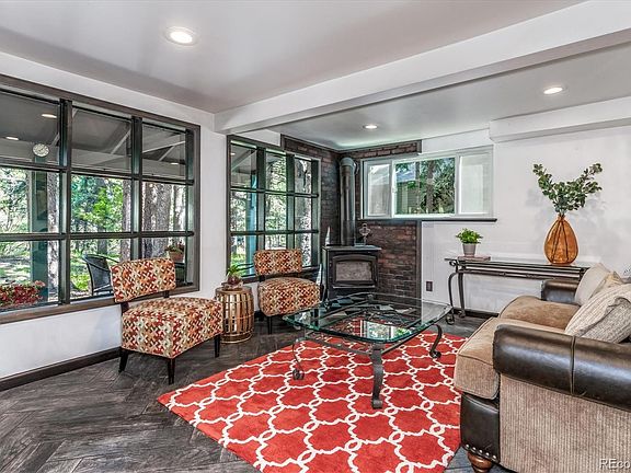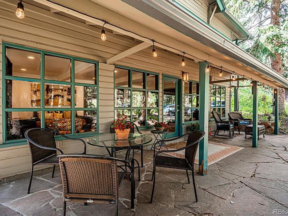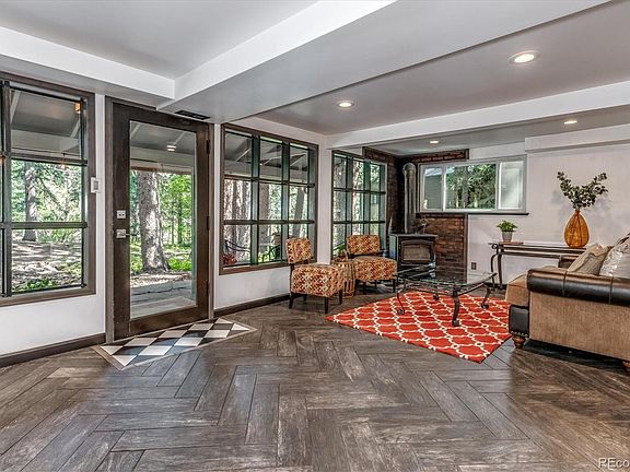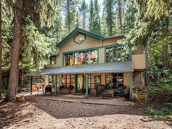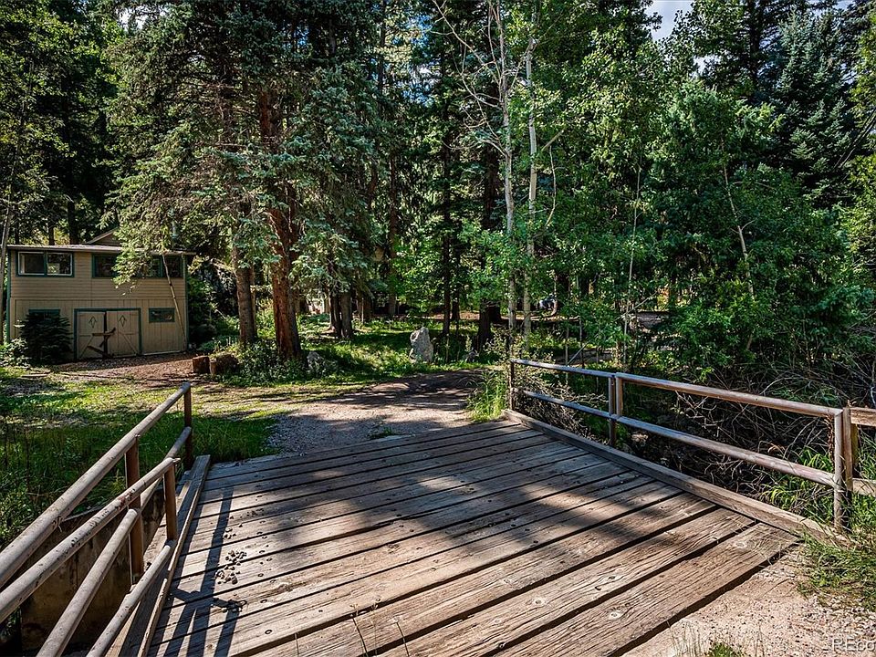Your cabin in the Evergreen woods, on the creek, with easy access via county-maintained road, awaits you here! Towering ponderosas and massive rock outcroppings on an acre of ground, bordering Apapahoe Natl Forest, make arriving home a magical event every time. You'll love the new kitchen, with island, open to the living room with its cozy wood-burning stove. The Primary bedroom suite is truly awesome with vaulted ceilings and wood accents, and picturesque windows that bring the scenic outdoors right inside. While it's only one bedroom in practicality, there are small rooms on both ends of the primary-- one a perfect home office, the other as an office or nursery. Plus, there's a bedroom retreat area that goes outside to the patio. The two-car oversized garage, with finished rooms above is dicey, to be honest. It's of pole barn-like construction and structurally perhaps questionable so we're not giving it additional value to the property. But it's a perfect spot to build a new two-car garage with an ADU on top if the county approves. Brand new 1000-gallon, 2-bedroom septic system is being installed now.