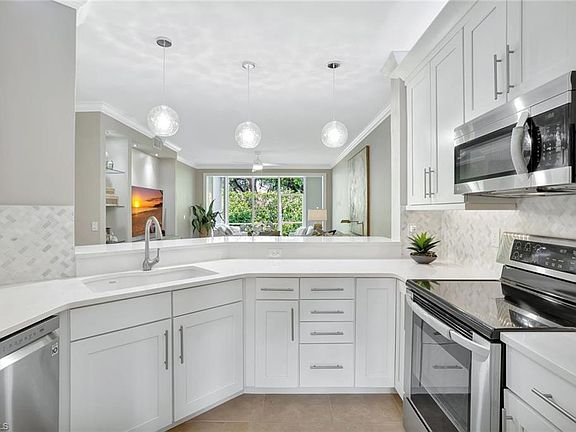 Beautifully renovated, this main-floor, three-bedroom condo enjoys bright western exposure overlooking the meticulously maintained grounds. The kitchen has been fully remodeled with fresh white cabinetry, sleek quartz countertops, and stainless-steel appliances. Both the primary and guest baths have been stylishly updated with new cabinetry, quartz counters, and tile finishes. Custom built-ins with glass shelving frame the flat-screen, adding a designer touch throughout the home. Recent updates also include mechanicals and new impact windows for peace of mind. Positioned on the south side of the building, the residence benefits from both southern and western exposure, filling the home with natural light. The former screened lanai has been upgraded with glass panels, seamlessly extending the under-air living space while still allowing the option to open up and enjoy refreshing Gulf breezes—the best of both indoor and outdoor living. Additional highlights include plantation shutters, a motorized rear lanai shade, updated laundry with new cabinetry, a large private storage closet perfect for bikes and beach gear, and a private one-car garage. This home has never been rented and is not subject to seasonal lease commitments. The Barrington Club offers its own private pool, spa, and community center just steps away. As a Pelican Bay resident, you’ll also have access to an impressive array of amenities: a state-of-the-art fitness center and spa, scenic walking and biking paths, tennis and pickleball facilities, miles of pristine sand beach, and two private beachfront restaurants with convenient north and south tram service. Ideally located in North Naples, Pelican Bay places you minutes from Waterside Shops, Mercato, Artis-Naples, and a wealth of dining and shopping destinations. Situated on one of the highest points in Pelican Bay, making it a rare and valuable find in one of Naples’ most prestigious communities.
