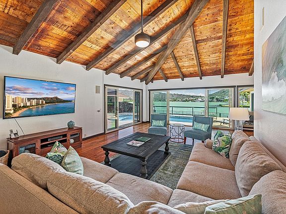 The tasteful furniture in the living room is elevated by the hardwood floors and the sky-high beamed vaulted ceiling, both adding additional warmth to the space. Natural light and cool breezes pour into the room from the expansive glass sliders that lead out to the pool, providing picture-perfect views of the marina and Koko Crater. The open floor plan flows into the newly remodeled kitchen, with beautiful quartz countertops. A charming bay window allows the sunlight to stream over the large breakfast bar, which can seat up to four people and is only one of a few dining options in this home. The adjacent dining room, where you can again find the gorgeous vaulted ceilings, offers additional seating for six people. Through a set of smaller sliding glass doors, you'll find yet another dining option in the covered lanai, as well as an outdoor kitchen, the perfect spot to spend your evenings feasting or chatting while enjoying the surrounding views. The covered lanai also includes its very own luxurious full-size bath. Once outdoors, you can go for a dip in the pool, lounge on the deck, or make your way down to the backyard where you can watch the kids play while reading a book under the shade of your very own coconut tree.