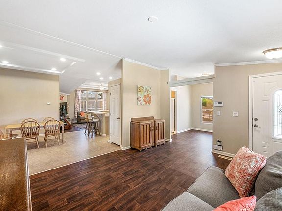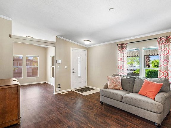This newer 2005 triple-wide manufactured home at Sam's Family Resort and Spa is on two lots, offering a large and very private enclosed yard space! The community is open to all ages. The 3 bed/2 bath interior has a generous primary bedroom with walk-in closet and adjoining bonus room. The open concept living area has a dining space and breakfast bar on one side of the kitchen, with an adjoining den and breakfast room/bonus space on the other side. There is also a wood burning fireplace that can be converted to gas. All furnishings and decor are included. For added energy efficiency the current owners have installed solar screens on the west and south facing windows, and a compressor saver and 220V surge protector to the AC system. Dual pane windows throughout! Exterior features include a spacious shed, covered carport parking for two cars, and dedicated off-street parking for two additional cars. Park amenities include a pool and four natural hot mineral spas, picnic area, volleyball court, recreation room, and an enclosed dog park. Buyers must be park-approved before making an offer. The current space rent for the two lots is $1,012 per month and may increase with the sale, to be verified with park management.