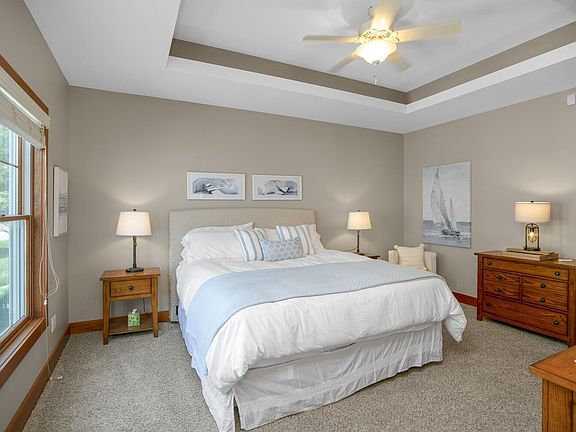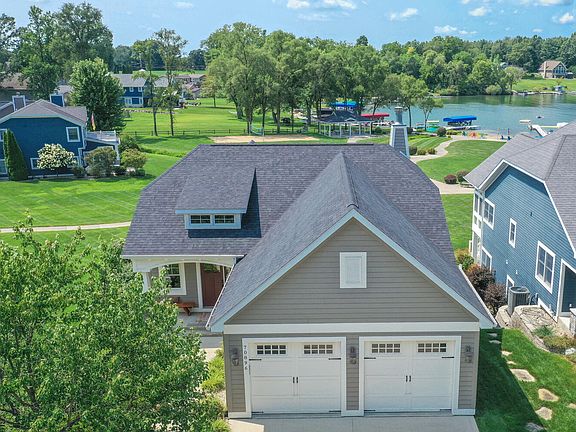 4 BD 2.5 BA 2,598-sq-ft Baldwin Lake home in SW Michigan only maintenance-free new-home lakefront community, move-in ready w/ furniture and furnishings turnkey. 2 boat slips, 2 toy barn lots, beach locker, access to 3-acre common space w/ 265 feet waterfront, large sandy beach, waterside patio, firepit, pavilion, beach volleyball court, playground. Large maintenance-free upper deck above covered patio, a sunroom w/ vaulted ceiling above screened rec room for magnificent lake views. Main level: kitchen w/ island w/ bar seating, eating area, stainless appliances, granite counters, mudroom access; dining area w/ stone fireplace, deck access; primary BD w/ recessed ceiling, primary BA w/ glass block shower; laundry; powder room. Downstairs: living area w/ patio access, kitchenette, eating area, 3 BD, BA. Columned entrance, wet bar, 2-car attached garage, accessibility features. 266-acre spring-fed all-sports Baldwin Lake is less than 2 hours from Chicago, 25 minutes from Notre Dame.