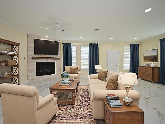 Interior highlights include high ceilings, extensive recessed lighting, crown molding, and blinds throughout. The kitchen features quartz countertops, new stainless steel appliances, a gas range, and plenty of cabinetry—perfect for entertaining. A walk-in pantry. Enjoy cozy evenings in the spacious living room with a modern gas fireplace.