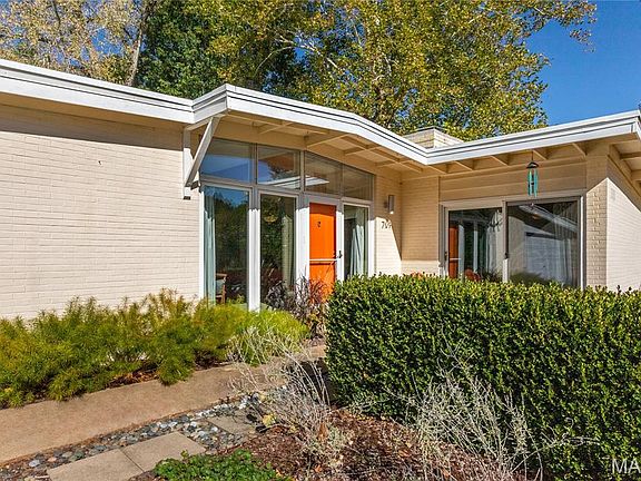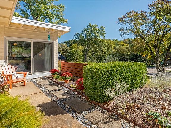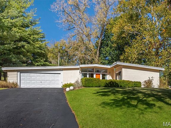 Located in the highly sought-after Historic Barrett Brae subdivision—honored as a Neighborhood of Distinction by the City of Kirkwood—this mid-century modern gem truly stands out! With 3 bedrooms, 2 full baths, and a bonus office, this home captures everything we love about MCM design: floor-to-ceiling glass, clerestory windows, vaulted ceilings, skylights and a bright floor plan that feels effortlessly cool. The newly reimagined kitchen includes Bosch appliances, quartz counters, a hip backsplash, and sleek custom cabinetry. Original 1950s tile in both bathrooms keeps the retro character alive. Terrazzo-style luxury vinyl tile flows through the main living areas, while warm wood floors and a gas fireplace create an inviting focal point in the family room. The spacious primary suite offers great closet space, a private full bath and patio access. Enjoy the screened-in porch for morning coffee or unwind on the large private back patio surrounded by lush trees. The oversized two-car garage with full front and rear access is hard to find. With its walkable location, lush surroundings, and placement within the award-winning Kirkwood School District, this beloved mid-century home is ready for its next owner to become its steward and continue its story.