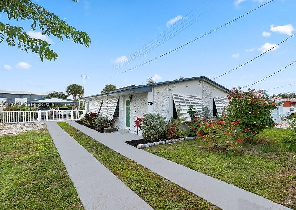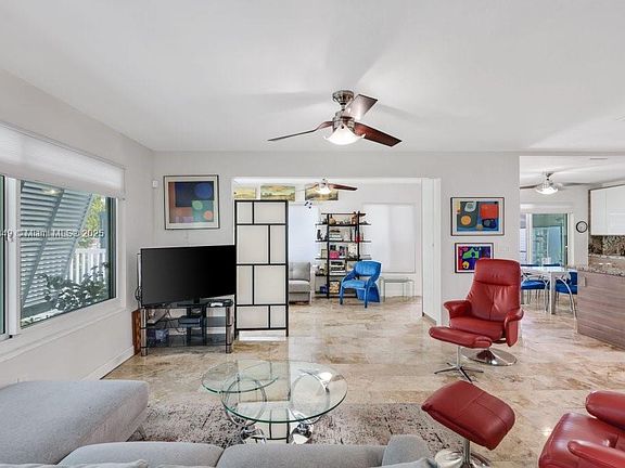 Upscale WATERFRONT home with mid-century flair in the hidden gem of Melaleuca Gardens! Enjoy total privacy on a spacious lot with an open concept layout, marble floors, high-end European cabinets, and massive windows flooding the space with natural light. Versatile den with attached bath can easily convert to a 2nd bedroom. Kitchen is perfect for entertaining with ample storage. Remodel in the last few years include roof, paint, impact/soundproof windows & doors, electrical panel, and A/C ducts, Heated pool and water heater. Relax on the screened porch or dock your boat (fits 45'+) at the shared dock with 100 feet of seawall. For boaters - Ocean access minutes to intercoastal and inlet. Beautiful gardens. Boat/RV parking, carport. Close to the airport, shopping, beach, dining & more!