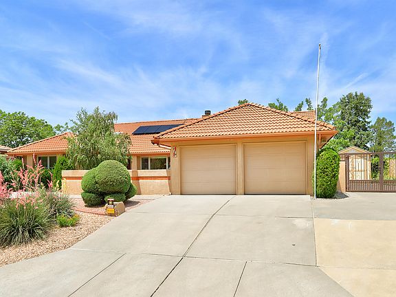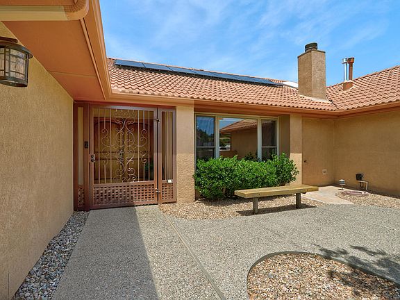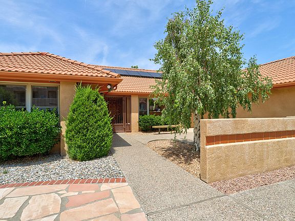 Beautiful single-story home backing to open space with stunning views in Four Hills! Bright, open floor plan with double-door entry leading to a spacious great room with high ceilings and a fireplace. The kitchen offers ample cabinet and counter space, black stainless appliances, & a sunny breakfast nook. The private, separated primary suite features a dual-sink vanity, jetted tub, separate shower, & walk-in closet. Beautifully landscaped front and backyards with lush grass, mature trees, flowering plants, two large sheds, & a garden. Enjoy the outdoors from the covered patio overlooking open space. Full side-yard access with paved parking--perfect for an RV or vehicles. Owned solar and recently installed AC! Close to The Canyon Club, golf, Kirtland AFB, shopping, & trails. Move-in ready!
