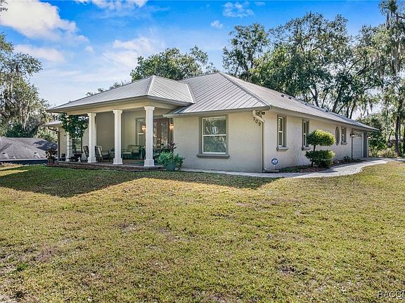 Handsome, classy, classic - all describe this 3 bedroom, 2.5 bath, 2-car garage home. A deep front porch allows for restful lounging, dinning. Enter a large living/dinning area. Further on is a stunning kitchen, kissed by sun entering a fused-glass bay window over the sink as well as a wall of windows over the breakfast area. Quartz counters, white wood cabinets, all add to the bright, light kitchen. All appliances are ss by Frigidaire. A Jack 'n Jill bathroom serves bedrooms #2 and #3 of the guest wing. Beautiful engineered flooring throughout. An interior laundry room has a window, a soak sink, a closet and cabinets for storage. Central vac for cleaning ease. A gem of a home is topped by a metal roof and sits close to downtown, historic Inverness and all the many entertainment and dining experiences that the City offers. Citrus County: a playground showing off its 3 lake chains on the east, The Gulf on the west, 7 rivers, the Withlacoochee State Forest and our 47-mile Rails-to-Trails. Full of healthy outdoor joy.