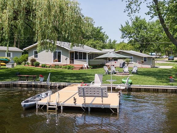 Beautiful LAKEFRONT Home with amazing setting & stunning WATER VIEWS! Open living space, 3 BRs, 2 FULL baths, modern kitchen w/ dry bar, Hardwood floors & vintage Limestone FIREPLACE. The ultimate Indoor/Outdoor living & ENTERTAINING w/ interior sliders that open to combine the screened-in porch & living space, additional sliders open to the huge backyard. Along the water's edge you'll find a NEW seawall w/ lighting, BOAT DOCK w/ seating to fish, & a firepit area. ***ALL SPORTS Lake & Vacation Rentals are allowed!*** LOCATION is just mins. to Lake Michigan, downtown shops, restaurants, vineyards & wineries. ALL THIS & a 2-Car Garage w/ attached storage shed, an extra concrete pad w/ 30amp service (park camper/RV/Pontoon/BOAT/etc.), CITY Sewer service, & a fully water-proofed crawl space!!