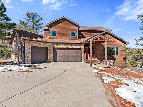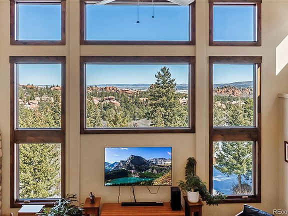 Breathtaking views of the Pike National Forest and stunning Red Rock formations from every window in the house! This fully renovated 4 bedroom, 4 bath home showcases hickory floors, knotty alder doors and trim throughout, tons of picture windows to enjoy the stunning views and a large wrap around deck. The gorgeous great room features floor to ceiling picture windows to take in the beauty of mother nature with views of the mature towering pine trees and beautiful red rocks. You are sure to enjoy the large wrap around deck perfect for taking in the stunning views with family and friends. The renovated gourmet kitchen is perfect for the chef in your family showcasing professional grade Wolf and Subzero appliances, top of the line coffee maker, pot filler, large slab granite island with plenty of prep space and an abundance of rustic knotty alder cabinets. The spacious dining area that is open to the kitchen is perfect for large family gatherings and is also open to the great room. Enjoy the dedicated private upper level master retreat with a relaxing bedroom featuring an enormous walk-in closet, 3 sided fireplace, numerous windows with stunning views and access to the private wrap around deck where you can enjoy your morning cup of coffee before you head into the luxurious 5 piece master bathroom with tile floors, 3 sided fireplace, a large soaking tub and an open oversized double headed walk-in shower. The private upper level also includes a separate room that could be used as a coffee bar, exercise room, nursery or craft room etc. The finished walk out lower level features 3 bedrooms, 2 bathrooms and a spacious family room which is perfect for family gatherings and guests. Walk directly across the street to enjoy hiking in the protected Pike National Forest and living in the beautiful Colorado mountains yet only be 35 minutes to the DTC or Northern Colorado Springs.