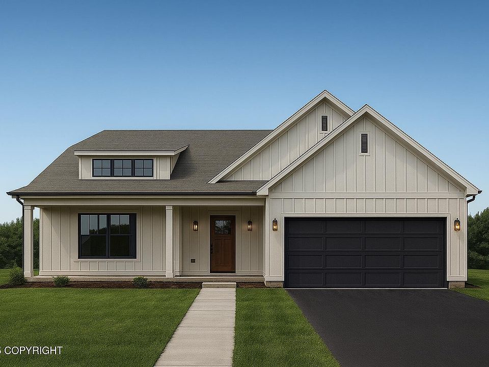 UNDER CONSTRUCTION-This single-story modern farmhouse was designed for the way Alaskans live year-round. Nestled in the sought after Settler's Bay golf course community-this home hits every mark. From the welcoming front porch to the bright, open living spaces inside, every detail balances comfort, style, and practicality for four true seasons.The heart of the home is the great room vaulted ceilings, a fireplace ready for winter evenings, a fireplace ready for winter evenings, and oversized windows that frame natural light even on short December days or for catching the northern lights in the night sky. The kitchen, with its quartz island, walk-in pantry, and custom cabinetry, makes holiday baking and cooking a joy. The Primary suite offers a calm retreat with a spa-like bath: a soaking tub for thawing out after a day on the slopes and a walk-in shower. Two additional bedrooms and a full bath are perfectly placed for guests or family. Out back, the covered patio extends your living outdoors. Picture grilling salmon on long June evenings, sipping coffee in the crisp fall air, or watching the snow fall in quiet comfort. A spacious two-car garage provides plenty of room for vehicles, gear, and storage to keep you ready for every adventure Alaska brings. Close to restaurants, walking trails and the golf course, this home blends timeless farmhouse character with modern finishes. This home isn't just a place to live it's a place to experience Alaska, season after season. DON'T WAIT!! Still time for buyer to make selections.