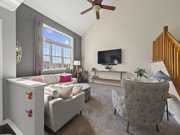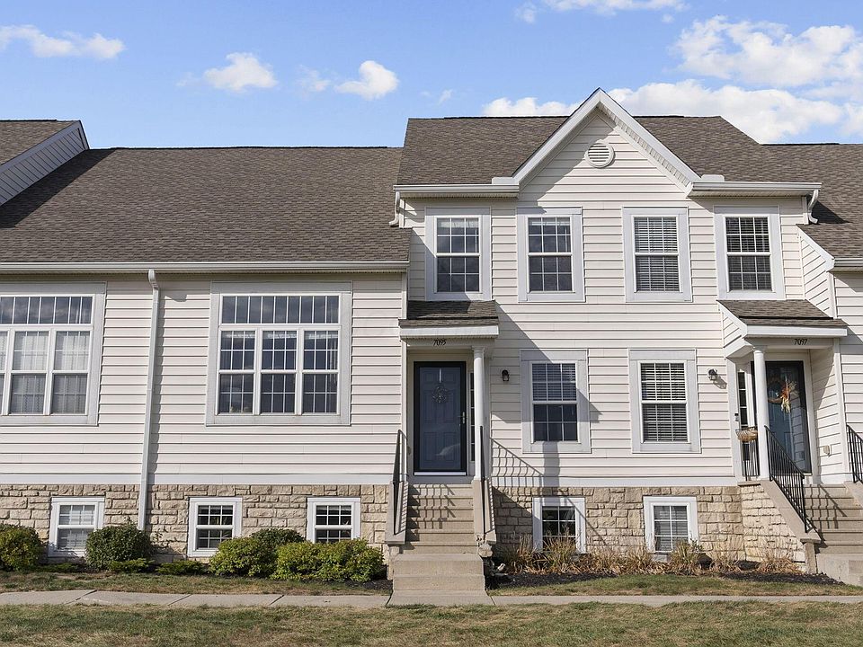 Welcome to 7095 Donerail Drive — a beautifully maintained, low-maintenance condo in the desirable New Albany Park community offering over 2,000 square feet of living space across three levels. Step inside to a bright and open two-story great room filled with natural light — the perfect space to gather, unwind, or entertain. The dining area flows easily into the eat-in kitchen, featuring white cabinetry, stainless steel appliances, and plenty of counter space for cooking and everyday living. A convenient half bath completes the main level.