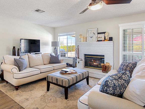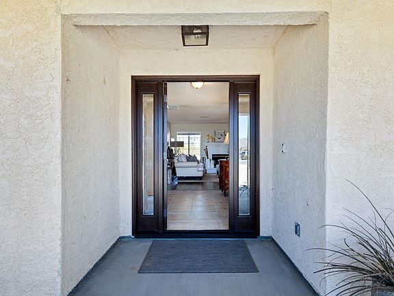 This stunning saltwater pool home near Joshua Tree National Park is the perfect entertainer residence for those looking for indoor/outdoor living. Located less than half a mile from the Indian Cove campground and showcasing panoramic mountain views, every detail of the property has been accounted for. Attributes include: fresh paint throughout; elegant shutter sliding doors; BRZ20 Bronze reflective sun control and daytime privacy film on all windows throughout; modern kitchen remodel with stainless steel appliances, stone countertops and tasteful cabinetry; both bathrooms were also renovated; tile and hardwood style laminate flooring throughout; beautiful front door and matching insulated garage door including insulated windows with Wi-Fi enabled opener and outdoor keypad; garage floor resurfaced and cabinets installed along wall; new washer and dryer; new roof installed on south side; new pool equipment plus cover and reel to keep it cool in the summer and automatic pool cleaner for convenience; and situated on almost half an acre with a fenced backyard for ultimate privacy. The evaporative cooler with programable thermostat to keep energy bills low was just replaced last year. Desert landscaping features Mediterranean Fan Palms in both front and back yards, and Beaver Tail Cactus with Juniper ground cover on berm. Host family and friends on the spacious patio featuring a fire-pit overlooking the pool and spa while surrounded by the picturesque mountain backdrop.