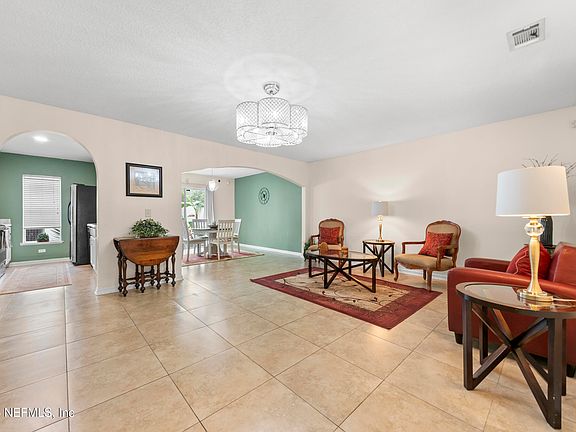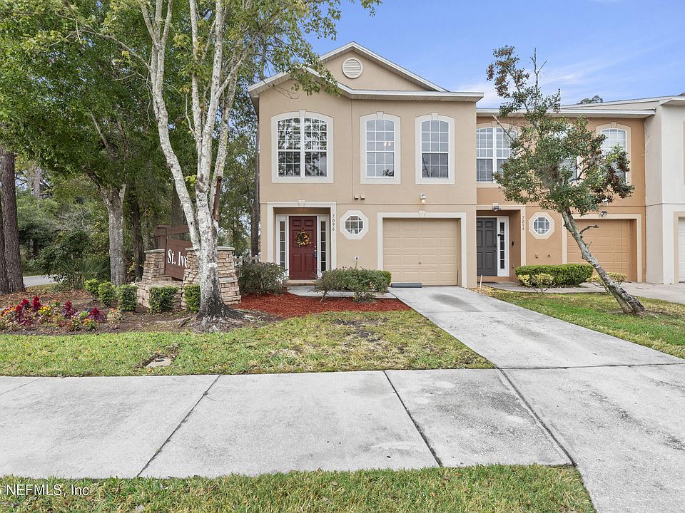 Beautifully maintained END-UNIT 3-bedroom, 2.5-bath two-story townhome with 1,661 sq ft in the desirable St. Ives community. This spacious home features tile flooring downstairs, wood-plank flooring upstairs, updated lighting and ceiling fans, knockdown ceilings, and classic 6-panel doors. A charming arched opening from the entry into the living room creates an inviting first impression, while the kitchen offers freshly painted cabinets, a breakfast bar, and a comfortable dining area for easy, functional living. Upstairs includes all three bedrooms plus a versatile flex room/loft ideal for an office, playroom, workout space, or additional living area, along with the convenience of an inside laundry room. Enjoy outdoor living on the private brick patio, and appreciate the benefits of an end unit with added privacy and natural light. Major updates include a new roof replaced in 2024, providing peace of mind and added value. Additional highlights include a 1-car garage, no CDD fees, and a modest HOA that covers landscaping and the roof for low-maintenance living. Conveniently located near shopping, dining, NAS Jax, major highways, and commuter routes, this move-in-ready townhome offers exceptional value. Put this one at the top of your list.