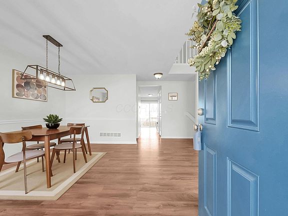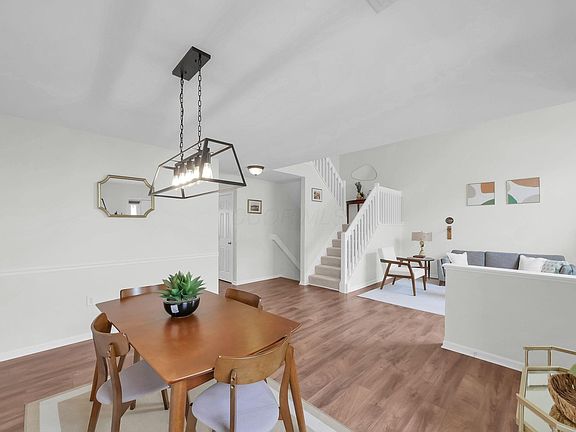 Sleek and special! This condo offers abundance of Space, bright, open rooms, low maintenance, stylish living in this 3-level condo in desirable New Albany area, low tax Columbus Schools. Enter to high ceilings, abundance of natural light with transom windows, wood-look vinyl throughout the first floor. Upgraded lighting, white painted woodwork. Kitchen has granite countertops, stainless steel appliances including new smooth-top range. Upgraded lighting throughout including lighted ceiling fans and can lights. Upstairs, two large bedrooms - Owner's suite has large, double closet, dual sinks in luxury bath, tub/shower combination. 2nd Guest BR with large closet and adjacent bath. Finished LL has recreation area, corner fireplace, office/bonus room and unfinished laundry/storage area. New HVAC, community has a clubhouse, fitness center, and pool included in the condo fee. Enclosed patio is ready for backyard fun - your turn to have the friends over! Property is minutes to 270, Intel/Google, and Easton shopping and retail.