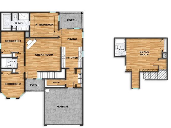 The owner’s suite is a private retreat with dual vanities and large walk-in shower. Two additional bedrooms and a full bath complete the main level, while upstairs a spacious bonus room with full bath adds flexibility for guests, a home office, or media room.