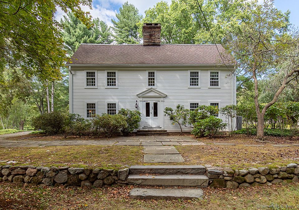 The Nathaniel Parks House circa 1706. Originally built in Guilford, CT, and painstakingly relocated to Woodbridge in 1934. This 5 Br, 3.5 bath, retains all of its original character, including wide plank floors, hand-hewn beams, and a striking double-leaf entry framed by fluted pillars and a pedimented gable. Thoughtful rear additions, including a gambrel wing with garage, were added during the move. Barn-style garage doors and a welcoming covered breezeway connect the main home to an additional wing. Inside, a fieldstone fireplace serves as the stunning focal point of the living area, complemented by exposed wooden beams that enhance the home's historic charm. The eat-in kitchen opens to a sunlit family room with soaring ceilings, four oversized skylights, and panoramic views overlooking the serene backyard. The primary suite features a full bath with a whirlpool jetted tub. Step outside to a brick patio overlooking 7.7 tranquil acres and a classic barn-perfect for storage. The property also includes an in-ground pool, which has not been opened in some time and presents an opportunity for restoration. Mature trees, lush landscaping, and a private setting create a picturesque environment. Large windows and a spacious layout provide generous natural light. A rare opportunity to own a historic Connecticut home full of character, warmth and elegance, in Woodbridge, close to restaurants, shops and Yale New Haven!