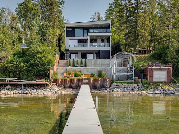 Welcome to The Cliffs — a breathtaking custom lakefront residence built by Square Structures, recipient of the Central Alberta Building Association's Award of Excellence. This architectural masterpiece offers a seamless blend of luxury, function, and connection to nature, with panoramic south-facing lake views from every level. Designed with wall-to-wall, floor-to-ceiling triple-pane windows, the home is flooded with natural light and offers uninterrupted views of the water throughout. Step outside to enjoy 1,750 sq ft of outdoor decking, including a screened-in living space with gas fireplace, ceiling heaters and TV — the perfect extension of your indoor living. The striking exterior is finished with a premium combination of EIFS stucco, King Klinker brick, Cham Clad, and Lux Architectural panels, setting the tone for the elevated design found within. Enter through a 4'x8' custom front door into an open-concept main floor featuring 8†wide-plank engineered white oak flooring, a spacious living area, and a fully custom kitchen complete with porcelain countertops, high-end appliances, a built-in ice maker, built-in coffee machine, induction cooktop, and a walk-through pantry housing a full-size fridge and freezer.