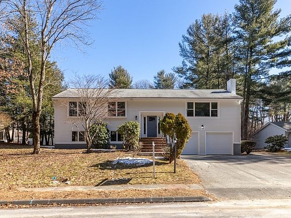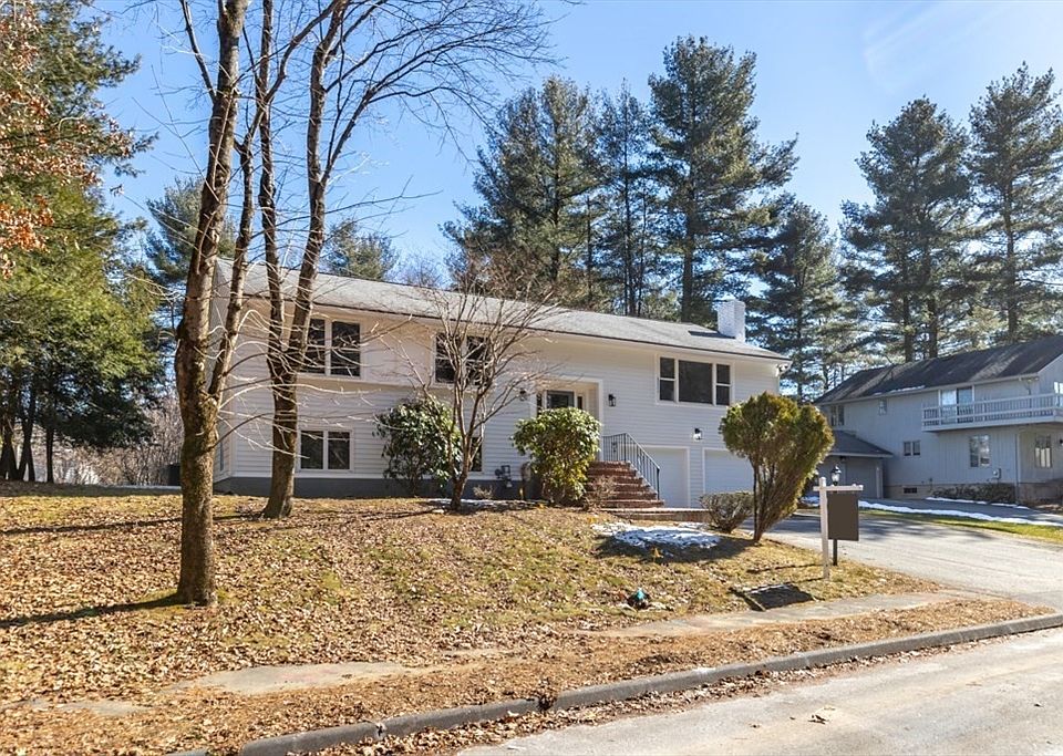 This renovated split-entry home, a hidden gem on a tree-lined cul-de-sac, is adjacent to Conservation land. The Serene private lawn sets the stage for a dream outdoor oasis. With 4 generous bedrooms, new Hardwood floors, and three fully renovated baths, this home combines comfort and practicality. The two-car oversized garage adds convenience. Two levels of sun-drenched living spaces feature family, living, and entertainment areas. The family room seamlessly flows from spacious rooms with railings, exposed beams, and a fireplace. The updated kitchen with quartz countertops, opens to the dining room, providing easy access to the composite deck for outdoor enjoyment. The first floor includes a primary bedroom and two additional beds. The lower level boasts another bedroom with an office/rec room,laundry area, and a fully renovated bath. This home is equipped with new ,Hardwood flooring thru out ,New heating systems,,updated electrial & Plumbing,and so much more.