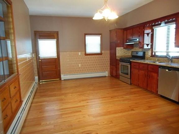 Two plus bedroom apartment, located in W. Newton, totally renovated, brand new hardwood floor in kitchen, hallway and 3rd room, all rooms newly painted, refinished hardwood in rest of rooms, large rooms with great closet space, high ceilings, brand new appliances in kitchen including stove, refrigerator, dishwasher, granite counters, lots of counter space, brand new smoke detectors, bathroom renovated with new tub and tile area around tub, laundry in basement, parking available in yard, close to commuter rail and bus route to Boston.