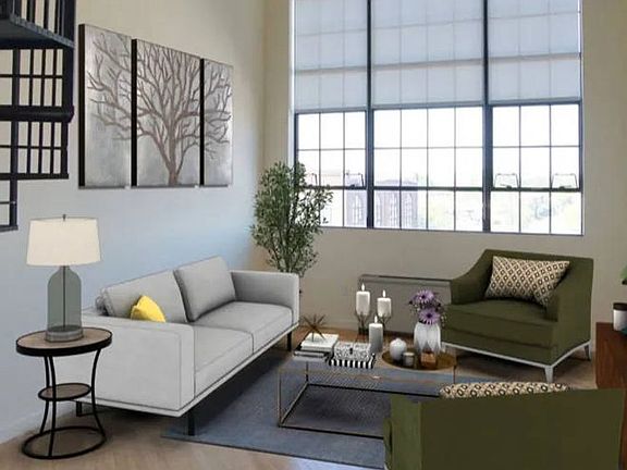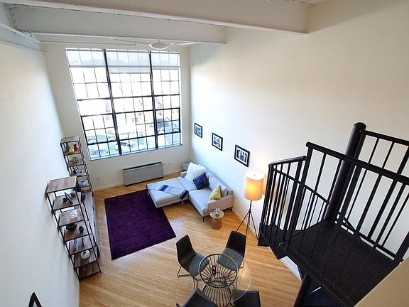 Enjoy natural light from a 10'-10" x 14' window flooding into an open living room with 207" ceilings. Bedroom overlooks living area, connected via spiral stairs. Built-in solar window treatments put you in control of brightness, solar heat gain, and privacy.