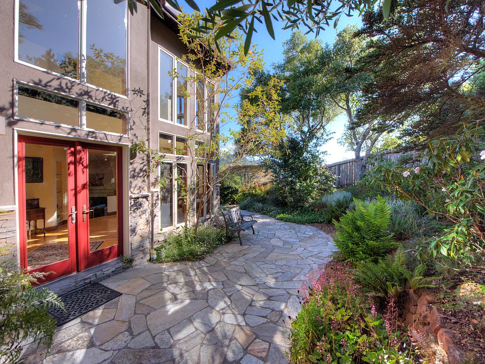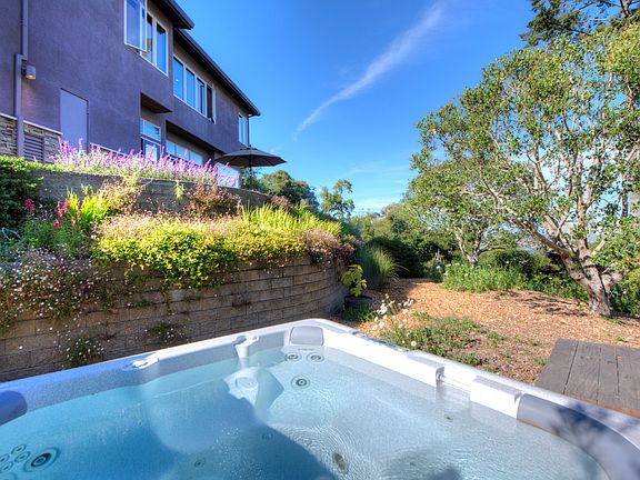 Private oasis next to parkland. Beautiful stucco home illuminated by well-placed windows, clearstories & glass doors capturing stellar views of Black Mt & West Marin vistas. Flowing floor plan opens to hidden acre overlooking open space where there're no rooftops & no road noise. Private yard basks in southern light w/flagstone patio, hot tub, bocce court, fruit trees, veggie garden, native oaks & gate to trails. Garage wired for electric car.