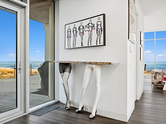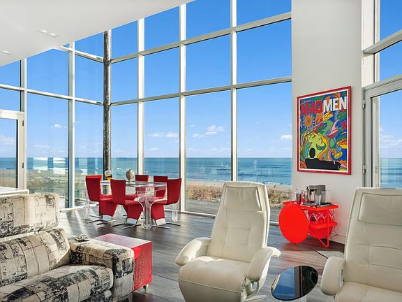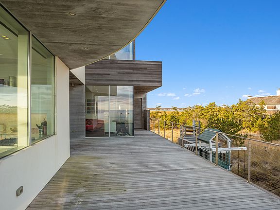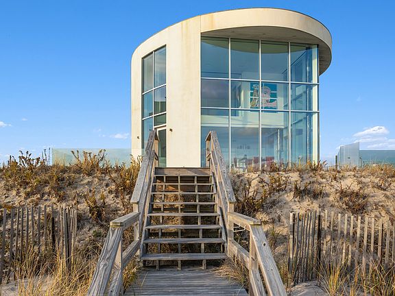 This artful oceanfront rental available for August or 2 weeks in August. Perfect Hampton's getaway spot. Dune road in East Quogue is very serene with bay views on one side and beautiful tall grasses and dunes along the way then what could be better than enjoying your own oceanfront with 360 degree water views all around. This beach home know as "The Round House" was built by international architects Barnes Coy. The masterpiece is "sculping volumes in space" an oval and rectangle offering wonderful light and views of the Atlantic and the bay. The main level has 20 foot walls of glass featuring the living room with fireplace and open sleek kitchen and dining area expandable for up to 30 persons. There are sunrise and sunset decks. The box part of the home offers an office that can be converted to the 5th guest suite with en-suite bath. There is also a guest suite and powder room. Up the modern staircase is the primary suite that hangs over the double height living space and is meant to enjoy the whole home or for privacy there is a sliding glass door. The bath has a walk in shower and then a curvilinear extrusion becomes a balcony with an outdoor shower. Two other guest suites with private balconies are beautifully furnished and have fabulous views. The home is complete with black-out shades. There is a heated pool and jungle gym plus a storage room for beach items.