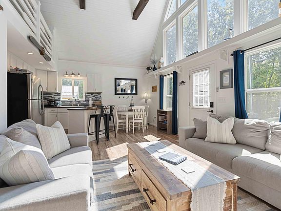 Immaculate a-frame homeEat-in kitchen with islandOpen floor planTall windowsNatural lightPrivacy for backyard bonfires
