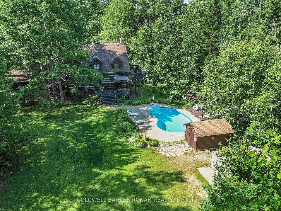Storybook Retreat in Pine River Estates. Tucked away on a picturesque 2.32-acre private lot, this gorgeous log home is the perfect blend of rustic charm and modern comfort. Steps away from Simcoe County Forests, where you can enjoy hiking, biking, and ATV trails. Imagine waking up to the peaceful sounds of nature, sipping coffee on your romantic balcony, and cozying up by the fire as the seasons change around you. Step inside to discover a warm and inviting main level, where the rustic open-concept design welcomes you with the crackling of the wood-burning fireplace. The spacious kitchen and dining area create the perfect gathering space, while main-floor laundry and interior garage access add to the convenience of the home. Upstairs, you'll find 4 spacious bedrooms, including a primary retreat with its own private balcony and semi-ensuite bathroom, the perfect escape for quiet mornings and starlit evenings. A bonus loft space offers endless possibilities, whether as a cozy reading nook, home office or play area for the kids. The finished basement is built for entertaining, featuring a games room, an electric fireplace and a pool table, setting the stage for endless family fun and relaxation. But the real magic unfolds in the backyard, a storybook setting with a large inground saltwater pool, a relaxing hot tub and a spacious deck designed for unforgettable summer nights. The perfectly manicured yard and firepit area completes this dreamy outdoor retreat, making it feel like your very own private resort. This home truly has everything you need and more, a serene escape with all the comforts of modern living. Don't miss your chance - book a showing today.