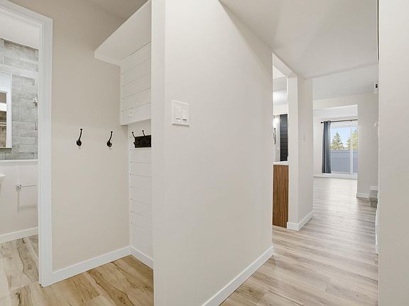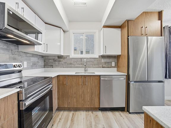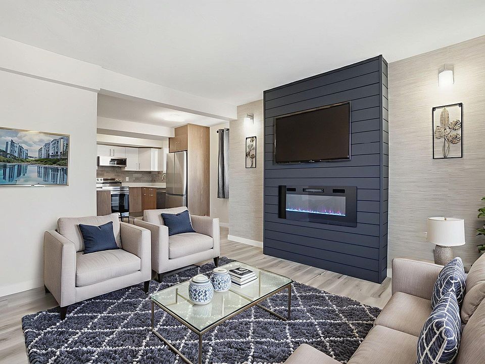 Beautifully Renovated Townhome in Lancaster Terrace. This stunning two storey townhome has been fully renovated from top to bottom, offering chic modern living at an affordable price. The main floor features a two piece powder room, stylish modern kitchen with white cabinetry, quartz countertops, and stainless steel appliances, opening to a spacious dining and living area accented by a striking feature wall with an electric fireplace. Step out onto your private balcony, perfect for morning coffee or evening relaxation. Upstairs, you will find a convenient laundry area, three bedrooms, including a beautiful primary suite with a gorgeous ensuite with tiled shower. The main bathroom is equally impressive with quartz counters and tile flooring. Enjoy new flooring throughout with vinyl plank on the main and soft carpeting upstairs. Includes one covered parking stall. This well managed complex offers exceptional value and a stylish, move in ready home in a fantastic location. Photos are virtually staged.
